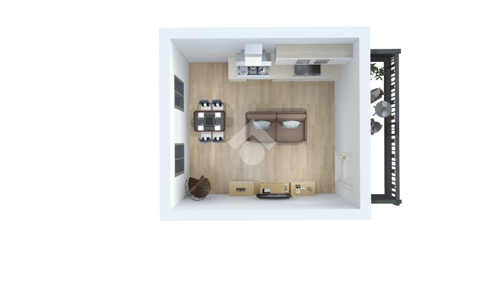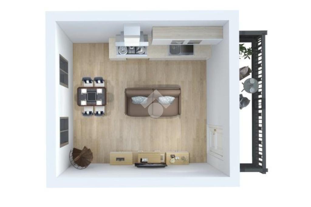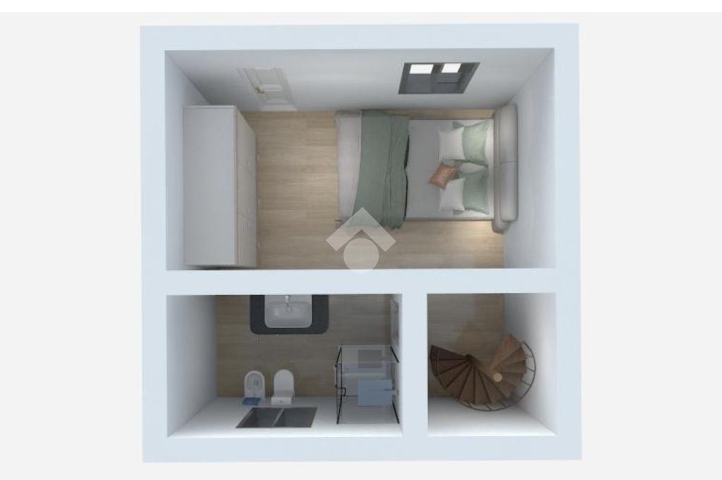 La soluzione presenta al piano terra un ingresso sull’ampio soggiorno con cucina a vista dal quale, tramite una comoda scala a chiocciola interna, si accede alla zona notte formata da una camera matrimoniale ed un bagno finestrato con doccia.