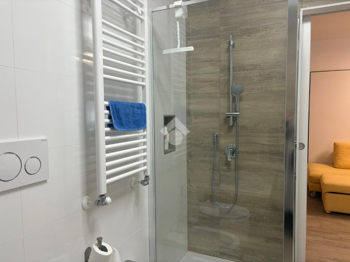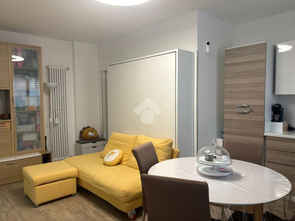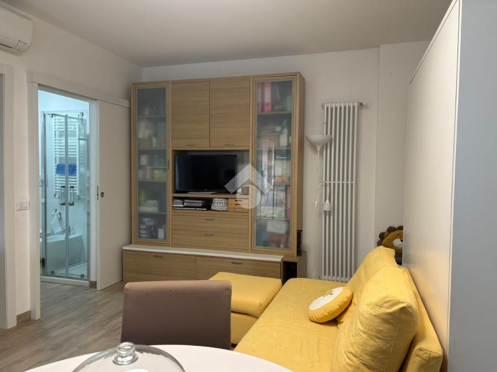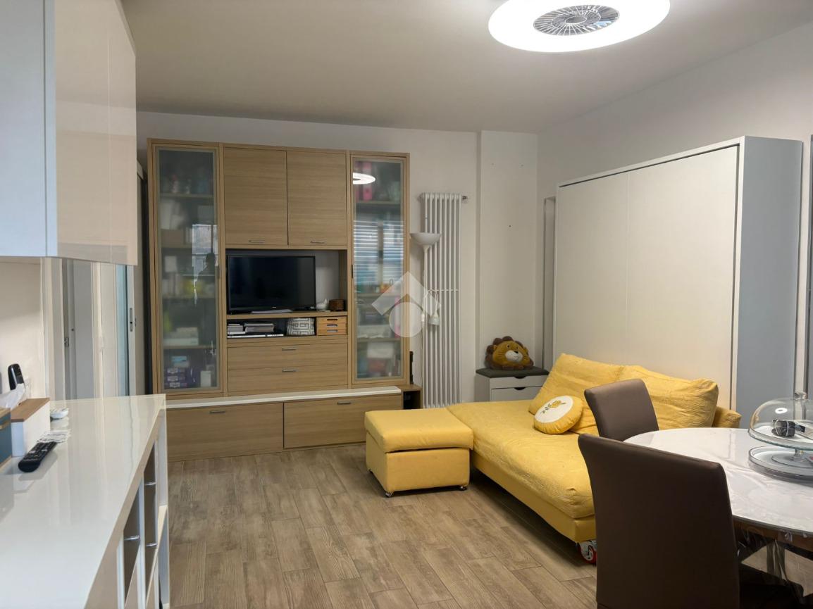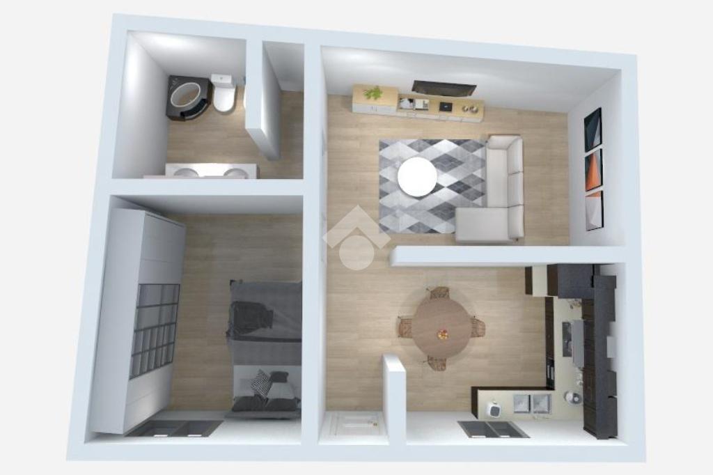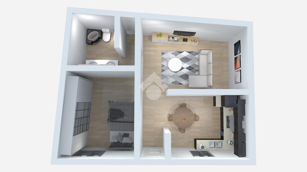 La soluzione presenta un soggiorno con cucina a vista, un bagno e una camera.