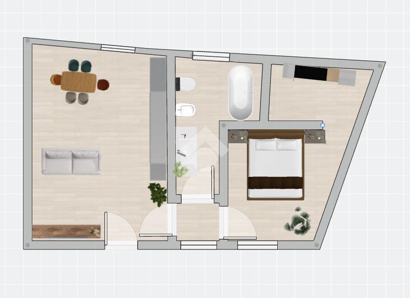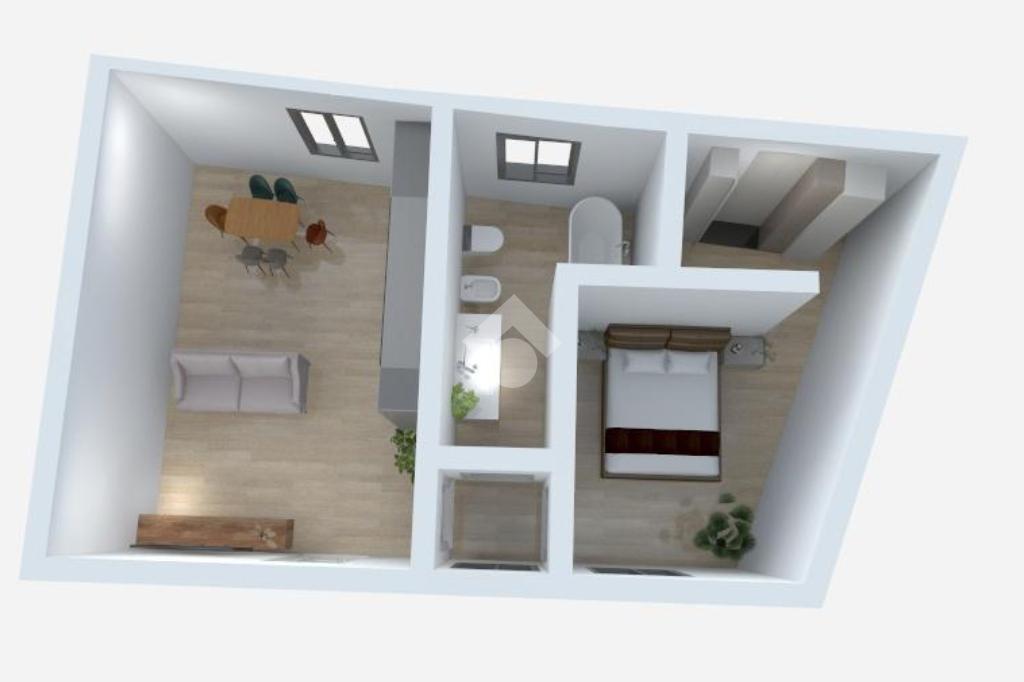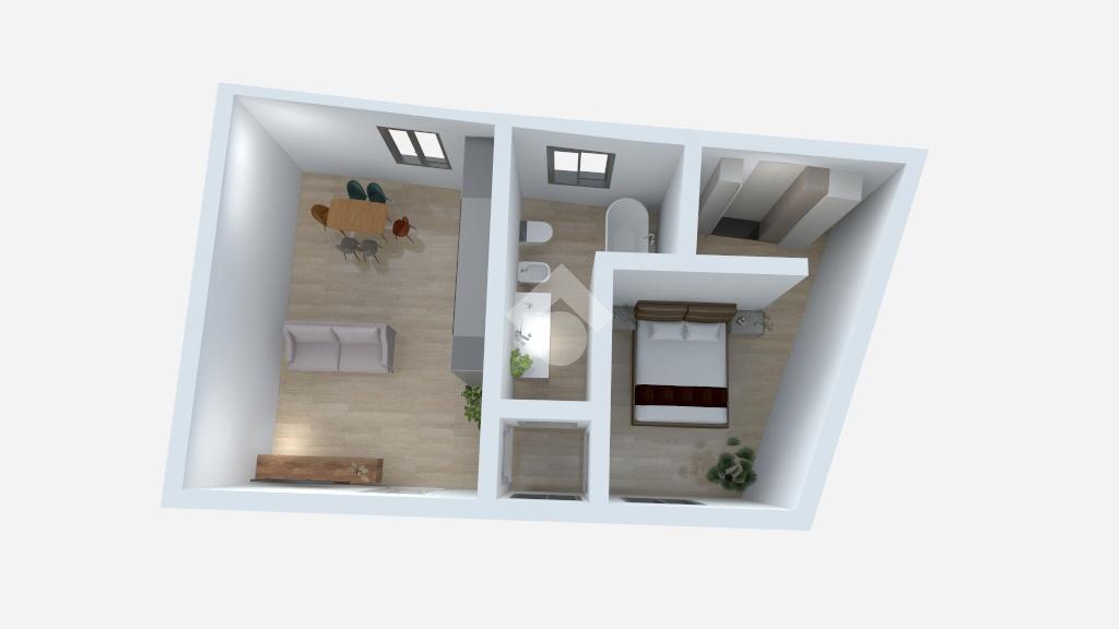 Un disimpegno separa la zona giorno dalla zona notte formata da un bagno finestrato ed una camera matrimoniale con cabina armadio.