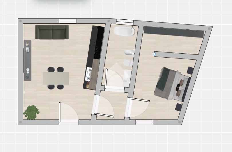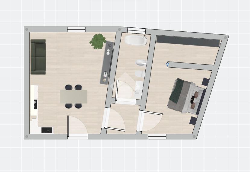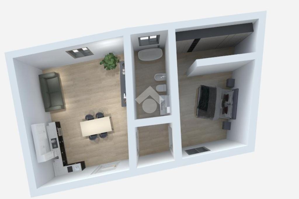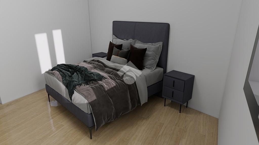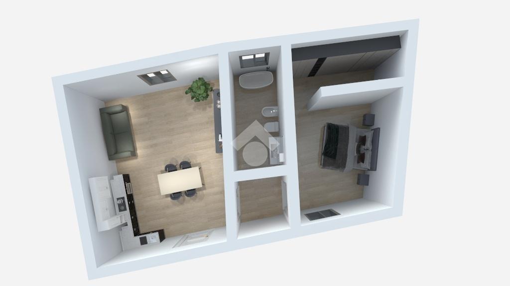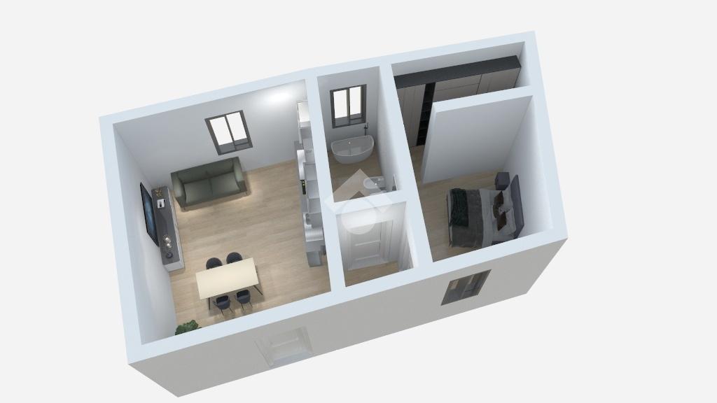 Un disimpegno separa la zona giorno dalla zona notte formata da un bagno finestrato ed una camera matrimoniale con cabina armadio.