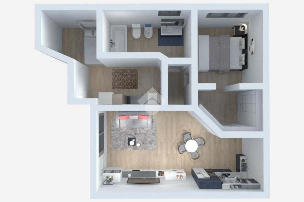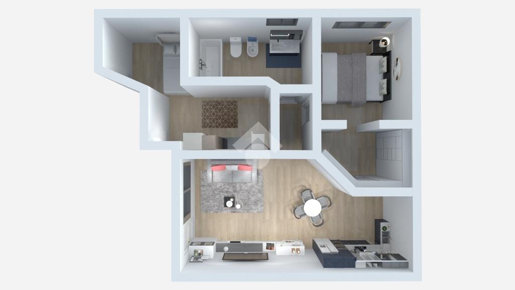 La soluzione situata al piano terra presenta un soggiorno con cucina a vista, un bagno finestrato e due camere di cui una matrimoniale.
